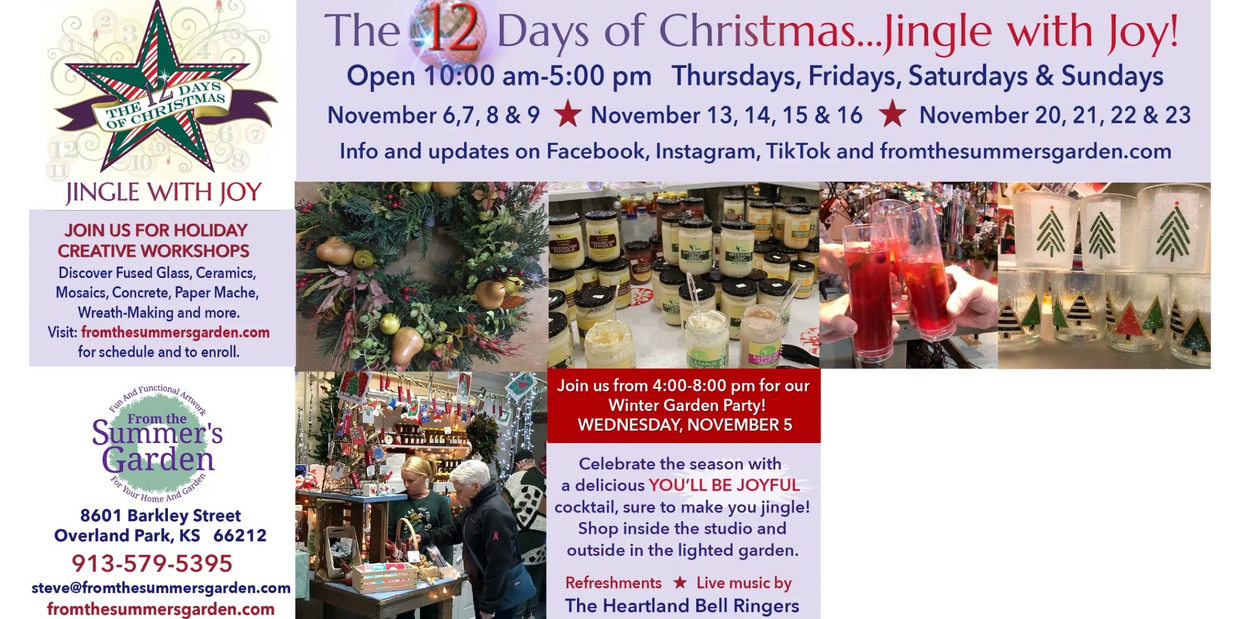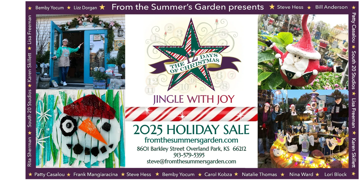 From the Summer’s Garden celebrates handmade art by 12 area artists displayed inside our studio and outside in the garden in two pop-up retail events held each year.